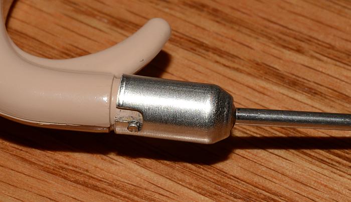 Next, while holding the eraser with a pair of needle-nose pilers, I VERY SLOWLY drilled a hole through the center. I chose a 1/32 inch drill bit which seemed to be slightly smaller than the outside diameter of the short tube that sticks out of the end of the Starset. This tube will receive the eraser. I destroyed the first eraser by drilling too fast, so for the second try, I took a full minute to drill through, that worked without destroying the project.